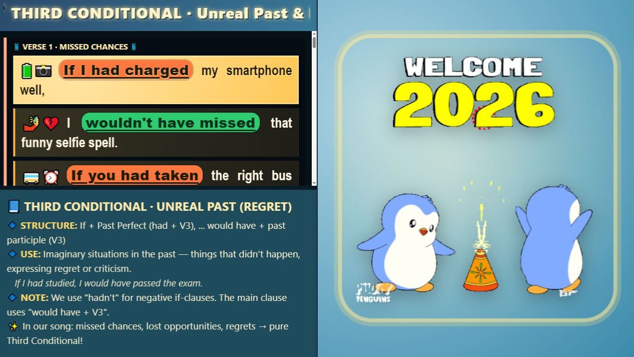 👀❤️ 🚀 ЕСЛИ БЫЛО ПОЛЕЗНО — ПОДПИШИСЬ! Заходи на сайт https://prosansay.ru!- Интерактивные уроки и подготовка к ВПР. Краткая инструкция: Перейдите по ссылке: https://prosansay.ru/ (браузер Google/Mozila предпочтителен) Управление уроком (клавиатура PC): 1) выбрал урок 2) клик по материалу Левый клик мыши выделяет текущее изображение Стрелка вправо → – переход к следующему заданию / шагу. Стрелка влево ← – возврат на один шаг назад. Клавиша Esc – убрать все всплывающие подсказки с экрана. Для школьников, студентов и всех, кто изучает английский и хочет навсегда запомнить Third Conditional (условные предложения третьего типа – нереальное прошлое, сожаление). 🎵 Что внутри: Обучающая песня в медленном, чётком речитативе (темп 70–80 BPM, пауза между строками – 1 секунда). Каждая строка озвучена отдельно – вы успеваете мысленно восстановить правило: If + Past Perfect → пауза → would have + V3 📚 Грамматика в макси‑контрасте: В тексте песни все конструкции If + had/hadn't + V3 выделены ярким оранжевым, а would have + V3 – зелёным. Вы видите структуру и сразу её запоминаете. ✨ Польза для изучения: Автоматическое запоминание формулы без зубрёжки Тренировка слуха и произношения (каждое слово разборчиво) Эмоциональная окраска (сожаление) помогает закрепить смысл Встроенное упражнение для самопроверки 🎧 Как использовать: Прослушайте песню, повторяйте строки вслух, делайте паузы после каждой фразы. Используйте выделение цветом, чтобы визуально зафиксировать правило. 📌 Структура видео: Куплеты – спокойно, как объяснение учителя. Припев – громче, эмоциональнее (чувство сожаления). Маршевый ритм 4/4 помогает удерживать внимание. Результат: вы перестанете путать Third Conditional и начнёте использовать его в речи без страха. 🏷 Хештеги #ThirdConditional #АнглийскаяГрамматика #Conditionals #EnglishSongs #ESL #УчимАнглийский #PastPerfect #WouldHave #РУТУБОбразование