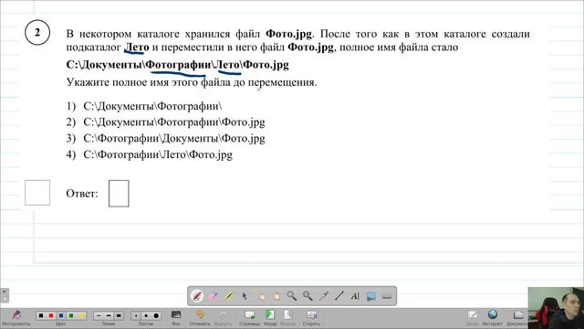 Буду рад подписке В некотором каталоге хранился файл Фото.jpg. После того как в этом каталоге создали подкаталог Лето и переместили в него файл Фото.jpg, полное имя файла стало C:\Документы\Фотографии\Лето\Фото.jpg Укажите полное имя этого файла до перемещения. 1) C:\Документы\Фотографии\ 2) C:\Документы\Фотографии\Фото.jpg 3) C:\Фотографии\Документы\Фото.jpg 4) C:\Фотографии\Лето\Фото.jpg